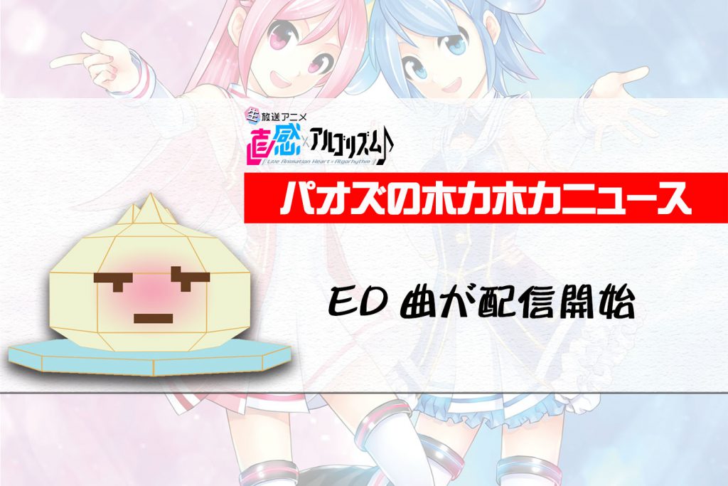 ED曲が配信開始 INFO 2017.08.24 俺だ。包子だ。なんとKillinとXiが歌うEDが配信されるぜ! これを見て、歌ってみたり踊ってみたりして投稿してくれた日にゃ、嬉しさのあまり、湯気モアモア、あちち包子だぜ! もしかすると番組で紹介するかもしんねーからよ、あんたと連絡とれるアカウントで投稿してくれよな? (YouTubeでニコ動でも、どちらでもウェルカムだぜ) 生放送アニメ 「直感xアルゴリズム♪」 ミュージックビデオ 「記念日/纪念日」