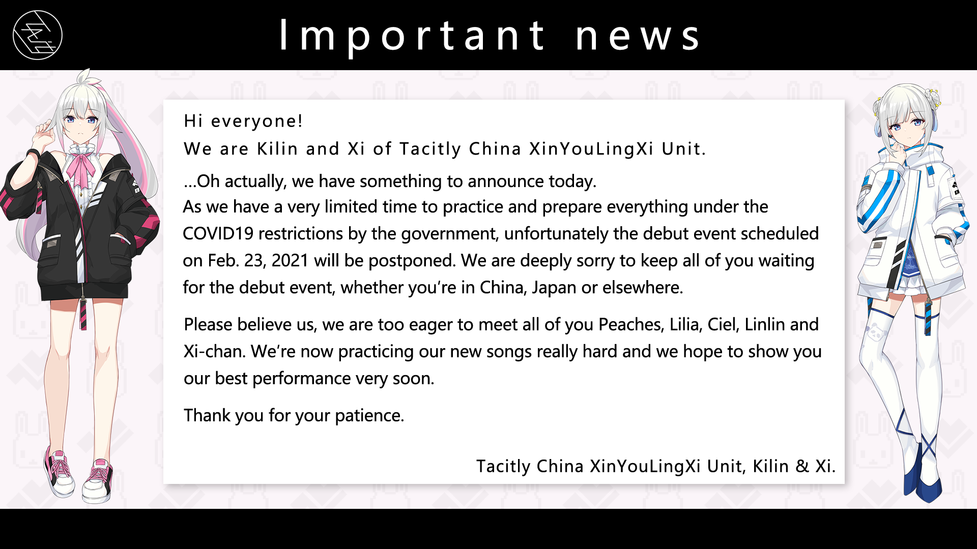 Debut Event Postponement Notice for Tacitly China XinYouLingXi Unit