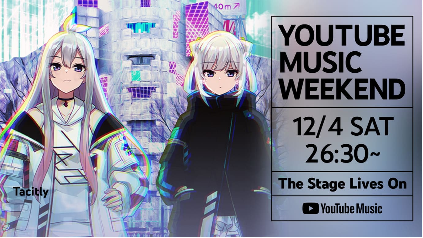 Tacitly will be one of the 12 Vtubers to participate in "YouTube Music Weekend Vol. 4", an online program where you can enjoy livestream of artists for three days from December 3 (Fri.) to 5 (Sun.), 2021. In addition to the YouTube premiere of our new song "Dreaming All Alone",an original and special video will also be shown during livestream! Tacitly is scheduled to show up on Saturday, 4 December, from 26:30 to 27:00!