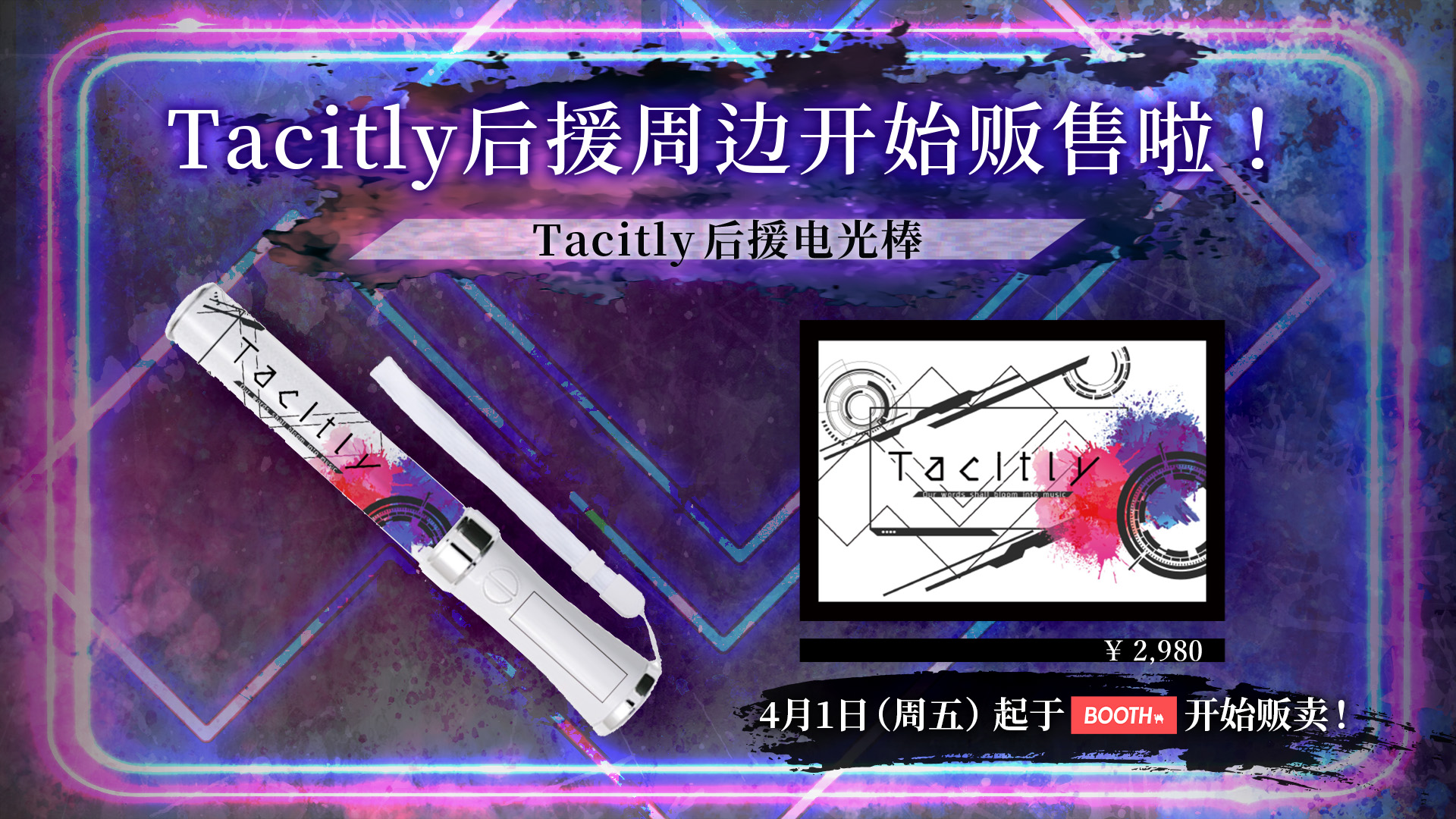 NEWS 2022.4.1 Tacily的后援周边开始贩售啦 Tacily官方的后援电光棒于4月1日(周五)开始贩卖 贩卖网址:https://algorhythm.booth.pm/items/3739327 周边产品资讯: Tacily后援电光棒 ¥2,980/支 ※产品价格均含稅。 ※图像仅供参考。 BACK